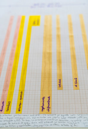 Este proyecto surge de una década de maternidad y de los cambios familiares, y, en consecuencia, de las transformaciones emocionales que los han acompañado. Desde el nacimiento de mi primera hija en 2015, he ido desarrollando una visualización de datos afectivos que recoge distintos hitos que marcaron puntos de inflexión en la vida familiar: la llegada de mi segunda hija, la enfermedad de otros miembros de la familia, tres mudanzas, la adopción de dos gatos, la transición desde la dependencia absoluta de los bebés hacia la autonomía de unas niñas que, quizá de forma prematura, ya rozan la adolescencia. Cada etapa ha supuesto una reconfiguración de la red afectiva, un desplazamiento en la intensidad de los vínculos, una nueva orientación en la vida cotidiana. Todo ello se traduce en diagramas emocionales que levantan columnas de color realizadas con papeles translúcidos, cuya altura depende de la intensidad de la emoción. Aunque en las últimas décadas hemos sido muchas las artistas que hemos reflexionado desde nuestra propia maternidad, un referente decisivo para mí es Mary Kelly, especialmente con su proyecto Post-Partum Document (1973 – 1978). Allí, Kelly proponía, en sus propias palabras, “my lived experience as a mother and my analysis of that experience” (Kelly, 1983, p. 39). Esa doble mirada, entre lo íntimo y lo analítico, entre la vida cotidiana y la construcción simbólica, me ha servido como horizonte crítico para pensar mi propio trabajo. En mi caso, esta visualización no fue concebida inicialmente como obra, sino como una necesidad vital. Esta siendo un modo de sostenerme en medio de la experiencia. Lo que ocurre es que, en mi vida, el arte y lo cotidiano nunca han estado separados, sino que se diluyen mutuamente. Por ello, tanto en mi filosofía vital como en mi práctica docente y artística, me acompaña siempre la premisa de Robert Filliou: “El arte es lo que hace la vida más interesante que el arte” (1984). Estos diagramas se van desplegando en un rollo de papel milimetrado canson de 10 metros de longitud, de los cuales he trabajado hasta ahora aproximadamente dos metros y medio. El resto permanece en blanco porque mi experiencia de maternidad y de familia sigue en curso, cambiante, y aún hay vida por explorar. Asi, este rollo que comenzó siendo ese espacio para la introspección que apenas me podía permitir al principio, sin tiempo, con sueño, pero con la adrenalina de quien se da cuenta de que sin haberlo pretendido, ha entrado en un hiato de producción artística pública, pero que sin embargo se siente más creativa que nunca, se ha convertido en una terapia, en un diario visual de viaje en la maternidad. En el centro del papel aparecen las emociones diagramadas; pero este centro tiene una zona vecina, en fricción, unos márgenes que permiten la relectura y cuestionamiento del discurso emocional central. Esas zonas son los márgenes, donde emergen las anotaciones manuscritas como recuerdos, palabras inventadas, canciones, frases que condensan momentos compartidos. El margen no acompaña como algo secundario, sino que sostiene otros discursos familiares, más íntimos y fragmentarios, que completan y a veces desvían el eje central. Escribir en los bordes es reconocer que la vida familiar no se narra solo desde el centro, sino también desde lo lateral, desde las voces múltiples que la constituyen. Mary Kelly también subrayaba cómo recurrir a diagramas y a un pseudo-discurso científico en Post-Partum Document no debía entenderse como registros objetivos o autoritarios, sino como estrategias para evocar “the sense of touch, so these signs invoke the sensuous, emotive quality of the mother’s lived experience” (Kelly, 1983, p. 41). En mi práctica, la experiencia táctil se vuelve decisiva: recorto y pego papelitos, coloreo cuadrículas, anoto a mano. En mi vida artística y en mi maternidad, las manos lo hacen todo. Son capaces de materializar emociones y pensamientos que el lenguaje no logra infiltrar. A este énfasis en lo táctil se suma la obra de la artista contemporánea Carmen Winant, para quien el contacto físico con la imagen es esencial en el proceso mismo de creación. Winant recopila fotografías físicas de fuentes diversas, muchas sobre la maternidad/reproducción, y comenta que a través del tacto descubre narrativas posibles y conexiones que no vería únicamente mirando. En su proyecto My Birth (2018), por ejemplo, despliega miles de imágenes encontradas del parto sobre paredes, frotando, reafirmando, reordenando las superficies como si fueran cuerpos que demandan ser tocados. Para Winant, tocar es comprender. Este gesto resonante refuerza mi convicción de que el tacto, la huella de la mano, ese roce directo con el material, no es accesorio: es núcleo del pensar-diagrama y del sentir materno en mi obra. El papel es aquí protagonista absoluto. Es un material liviano que, sin embargo, soporta todo el peso de mi maternidad, con sus deseos y frustraciones. Si bien ya habia sido protagonista de muchos de mis proyectos artísticos previos, en esta ocasión ha sido el medio cotidiano y disponible durante la infancia de mis hijas: no tóxico, no peligroso y siempre accesible. El papel me ha permitido jugar, aprender y crear con ellas. Lo que nació como un gesto íntimo y casi terapéutico (una forma tanto de ordenar como de desordenar mi mente, visualizando el presente) se revela hoy como obra: una escritura-diagrama personal y un paisaje emocional desplegado en una sola superficie que habla de familia y que guarda la memoria de una década de maternidad en transformación. Referencias: Kelly, M. (1997). Mary Kelly. Phaidon. Filliou, R. (1984). Dear Skywatcher: Art Is What Makes Life More Interesting Than Art. Sammlung Hoffmann, Berlin. Winant, C. (2018). My Birth. The Museum of Modern Art, San Francisco, CA. Exhibition and artist’s statement.